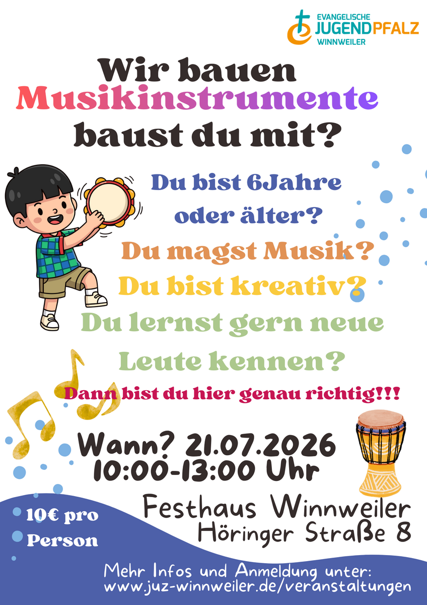 Wenn du gern Msuik machst und Lust hast, deine eigenen Instrumente zu bauen, dann bist du hier genau richtig. Kinder ab 6 Jahren sind herzlich eingeladen am 21.07.2026 von 10:00-13:00 Uhr gemeinsam mit uns im Festhaus in Winnweiler (Höringer Straße 8) kreativ zu werden.